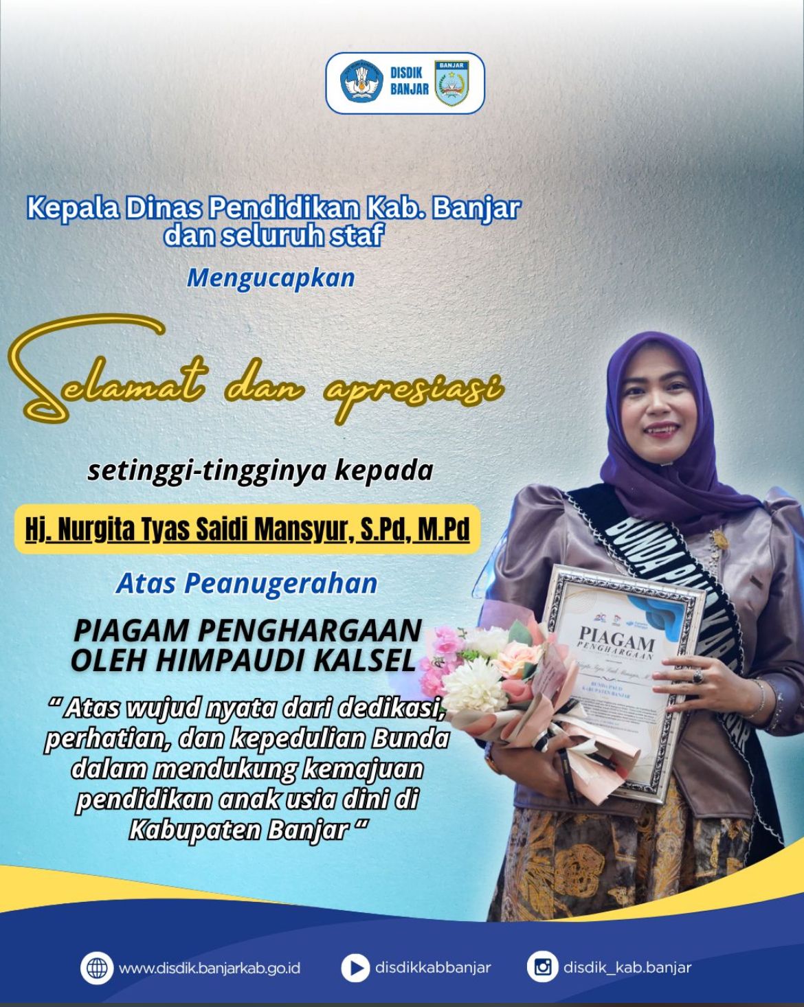Penghargaan tersebut diberikan sebagai bentuk apresiasi atas dedikasi, perhatian, dan kepedulian Nurgita Tiyas dalam mendukung kemajuan pendidikan anak usia dini di Kabupaten Banjar.