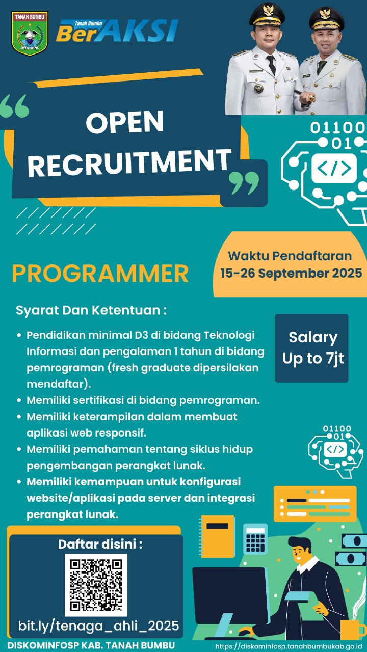 Bupati Tanah Bumbu, Andi Rudi Latif, melalui Kepala Diskominfo SP, Al Husain Mardani, mengumumkan bahwa pendaftaran sudah dibuka sejak 15 September dan akan ditutup pada 26 September 2025 mendatang. Para kandidat yang terpilih akan langsung bekerja di lingkungan Diskominfo SP Kabupaten Tanah Bumbu.