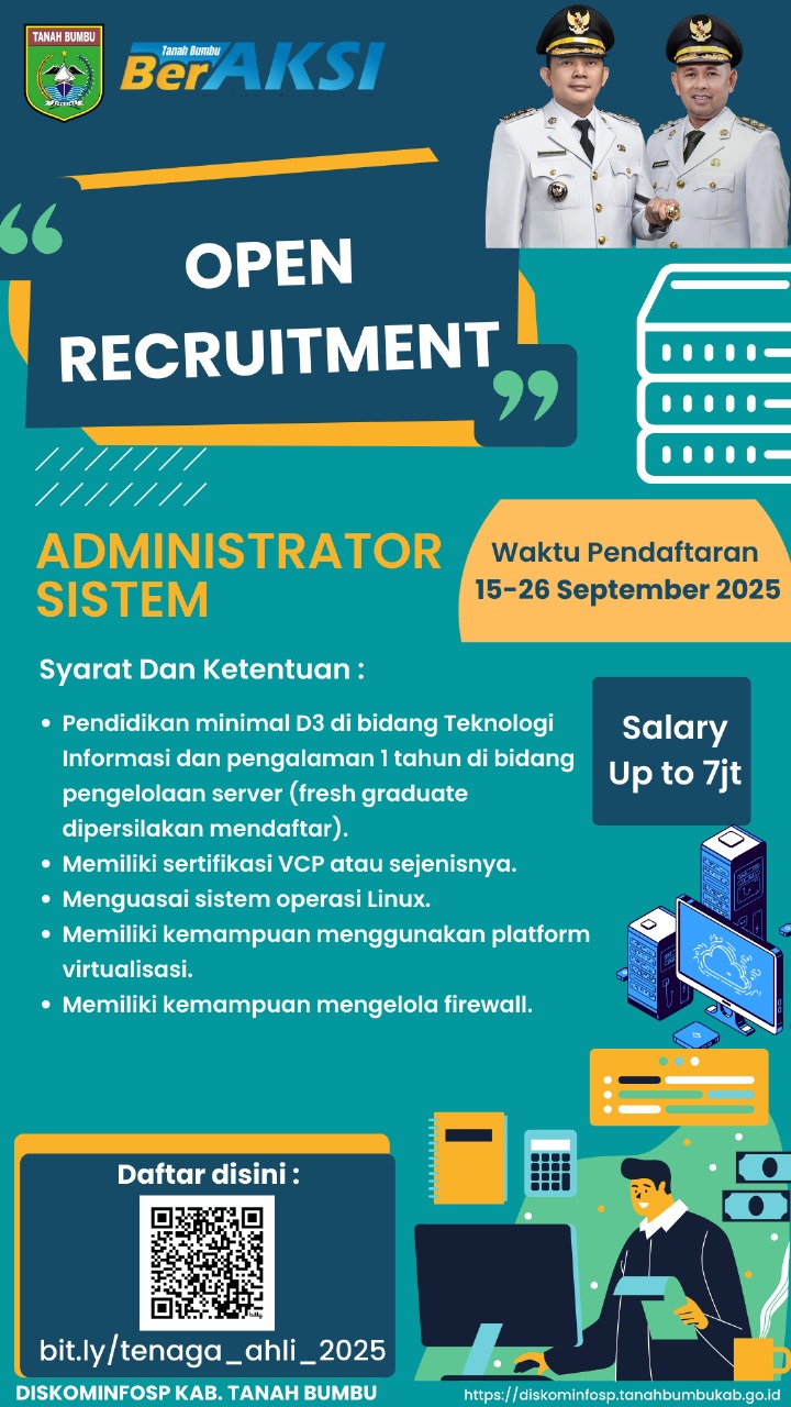 - Administrator Sistem: Minimal lulusan D3 Teknologi Informasi, pengalaman minimal 1 tahun di pengelolaan server, harus memiliki sertifikat VCP atau sejenisnya, menguasai sistem operasi Linux, mampu menggunakan platform virtualisasi, serta ahli dalam pengelolaan firewall.