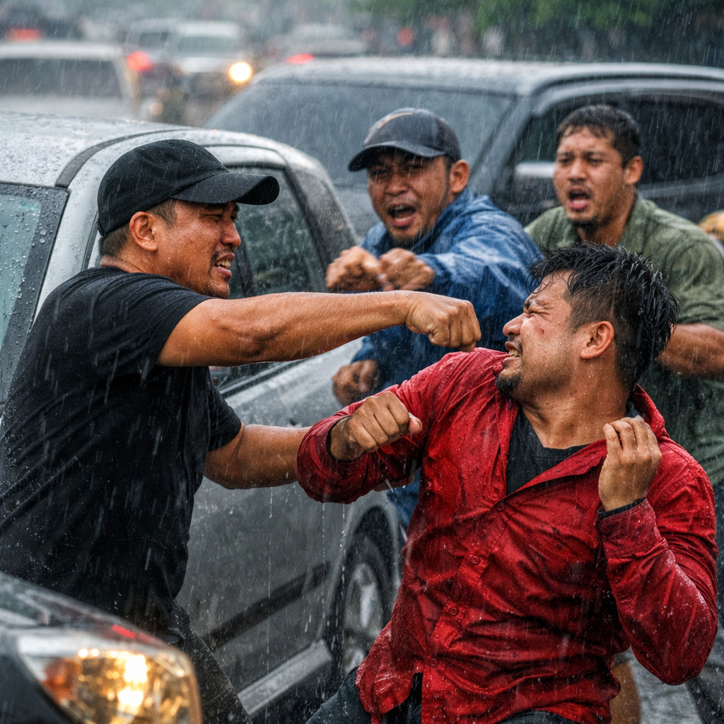 Dalam video yang viral, terlihat suasana jalanan tengah macet dan diguyur hujan. Seorang pria berbaju hitam bersama temannya yang mengenakan kaus lengan panjang merah tampak terlibat adu pukul dengan beberapa orang di tengah jalan. Aksi saling serang itu sontak mengundang perhatian pengguna jalan lainnya.