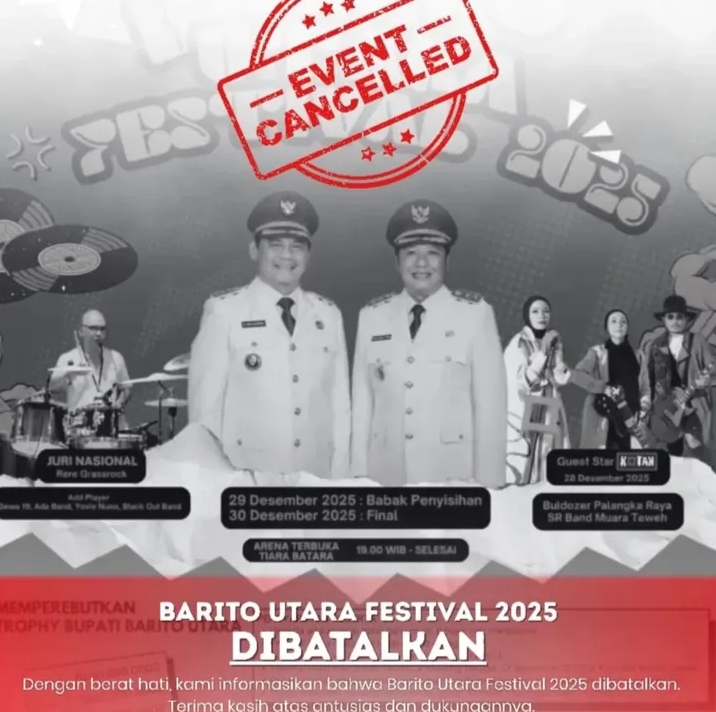 PUBLIKAINDONESIA.COM, BARITO UTARA– Pemerintah Kabupaten Barito Utara resmi membatalkan seluruh rangkaian hiburan seni, musik, dan penampilan artis dalam Festival Barito Utara 2025. Keputusan ini diambil sebagai bentuk empati dan solidaritas terhadap masyarakat Aceh dan sejumlah wilayah di Sumatera yang tengah dilanda bencana.