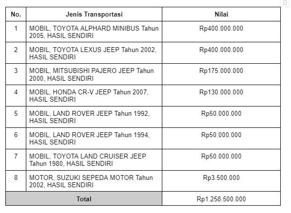 Jika merujuk pada rincian LHKPN, pada bagian alat transportasi dan mesin dengan total nilai sekitar Rp 1,25 miliar, yang tercantum hanyalah kendaraan darat.