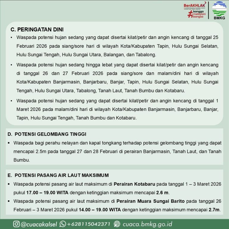 * 27–28 Februari 2026: Gelombang laut bisa mencapai 2,5 meter di perairan Banjarmasin, Tanah Laut, dan Tanah Bumbu.