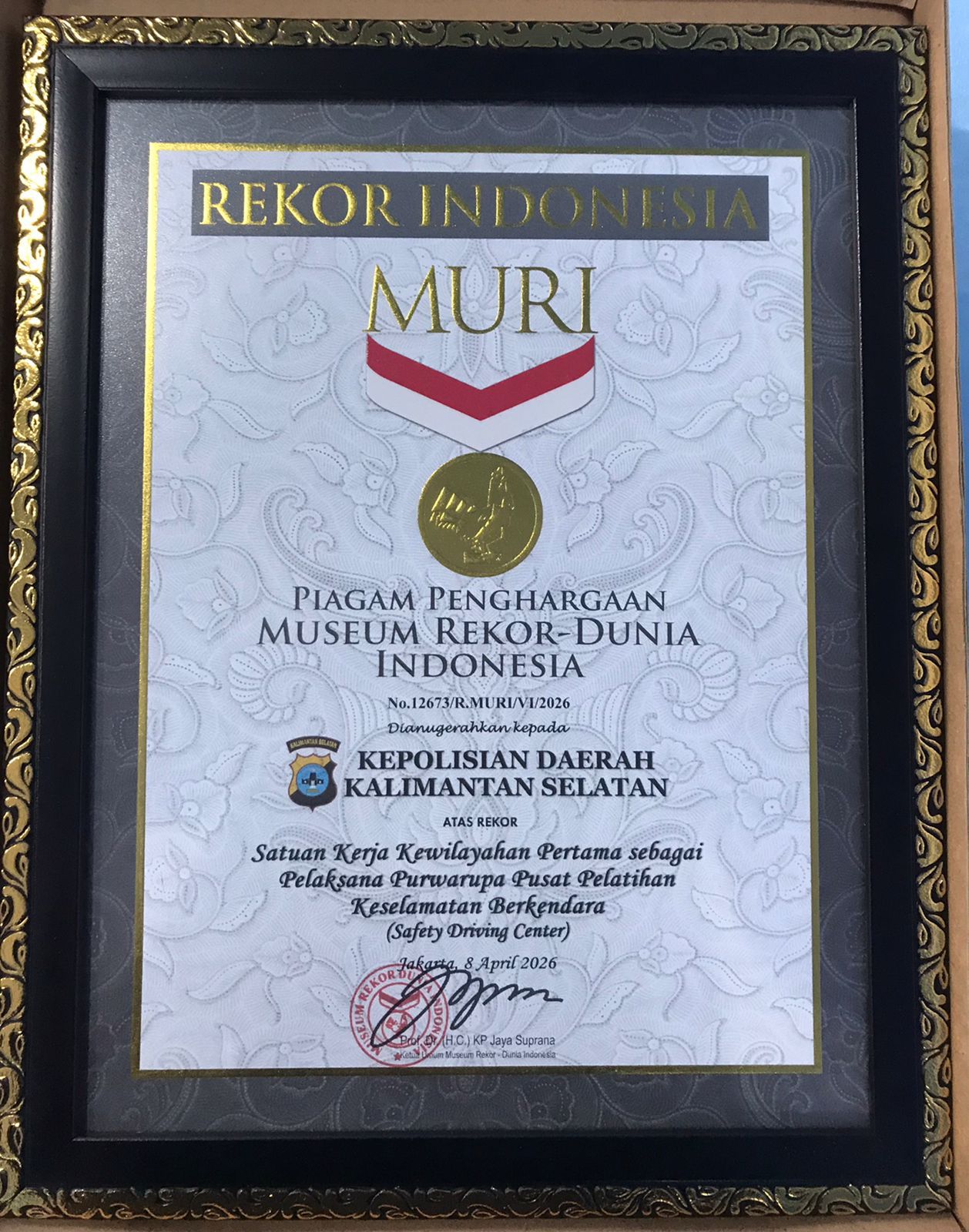 Penghargaan yang disahkan di Jakarta pada 8 April 2026 tersebut menjadi pengakuan nasional atas komitmen Polda Kalsel dalam menghadirkan inovasi pelayanan publik, khususnya dalam upaya menekan angka kecelakaan lalu lintas.