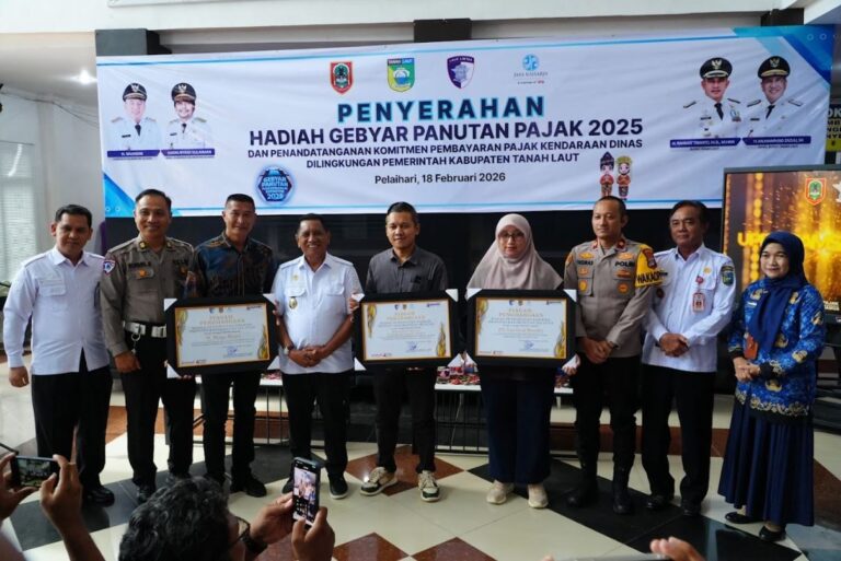 PUBLIKAINDONESIA.COM, PELAIHARI – Pemerintah Kabupaten Tanah Laut (Tala) bersama UPPD Samsat Pelaihari menggelar penandatanganan komitmen pembayaran pajak kendaraan dinas sekaligus pemberian penghargaan kepada wajib pajak berprestasi, Rabu (18/02/2026).