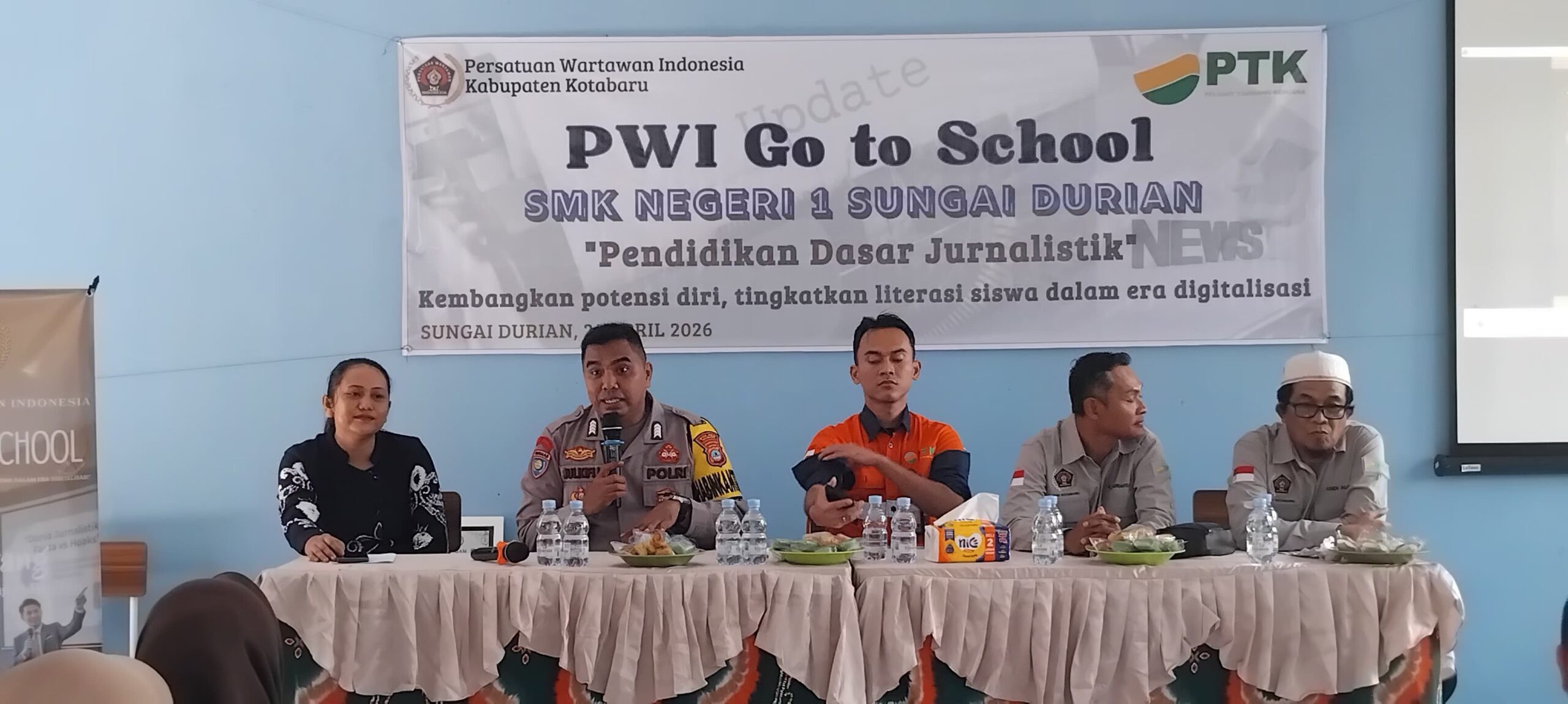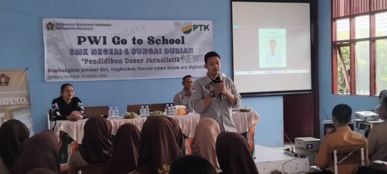 PUBLIKAINDONESIA.COM, KOTABARU – Persatuan Wartawan Indonesia (PWI) Kabupaten Kotabaru kembali menggelar program PWI Go To School sebagai upaya meningkatkan literasi generasi muda. Kegiatan ini dilaksanakan di SMKN 1 Sungai Durian, Jumat (24/04/2026), bekerja sama dengan PT Pelsart Tambang Kencana (PTK), dengan mengusung tema Pendidikan Dasar Jurnalistik.