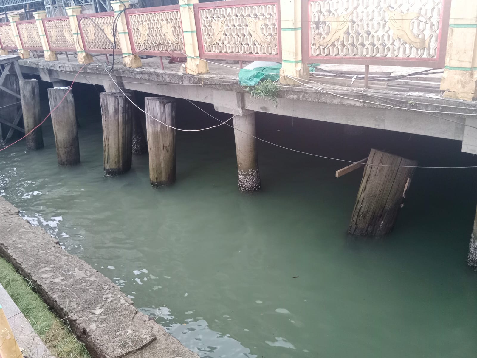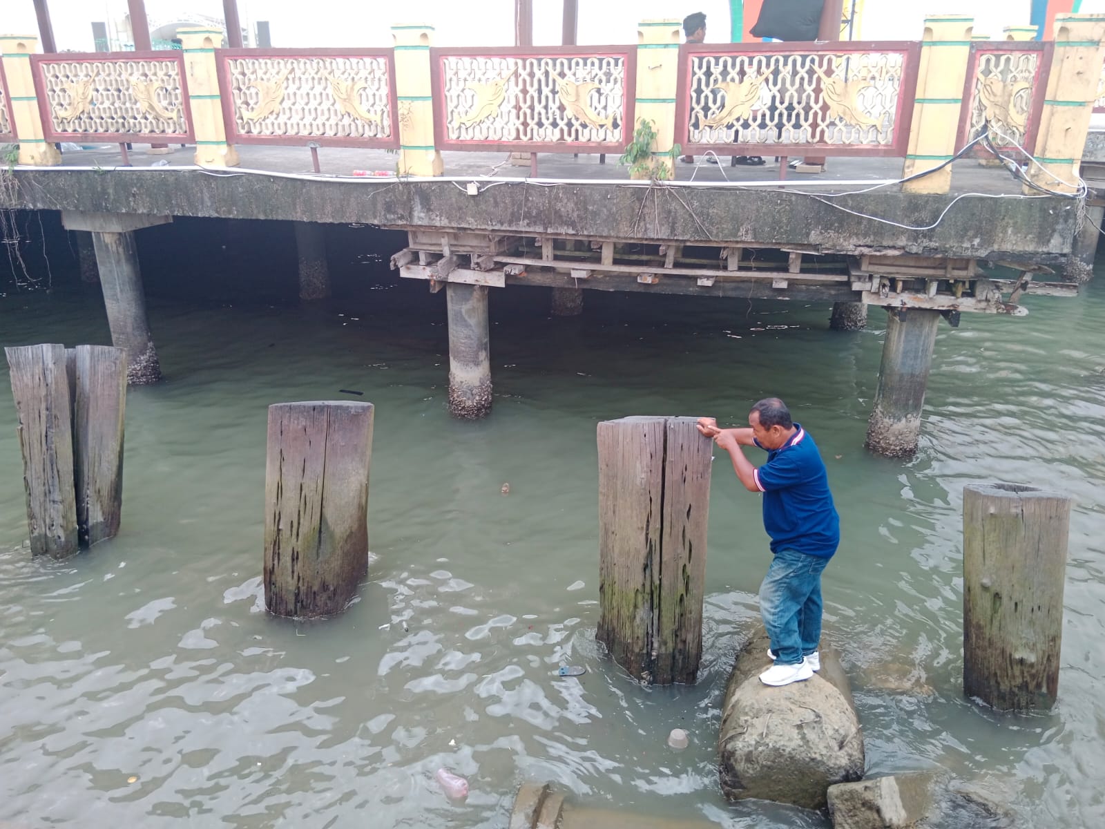 Pandangan menatap diantara tonggak tonggak pohon ulin sebagai penahan penambahan daratan, yang menancap di antara urugan tanah dengan tiang pancang bangunan di atas laut.