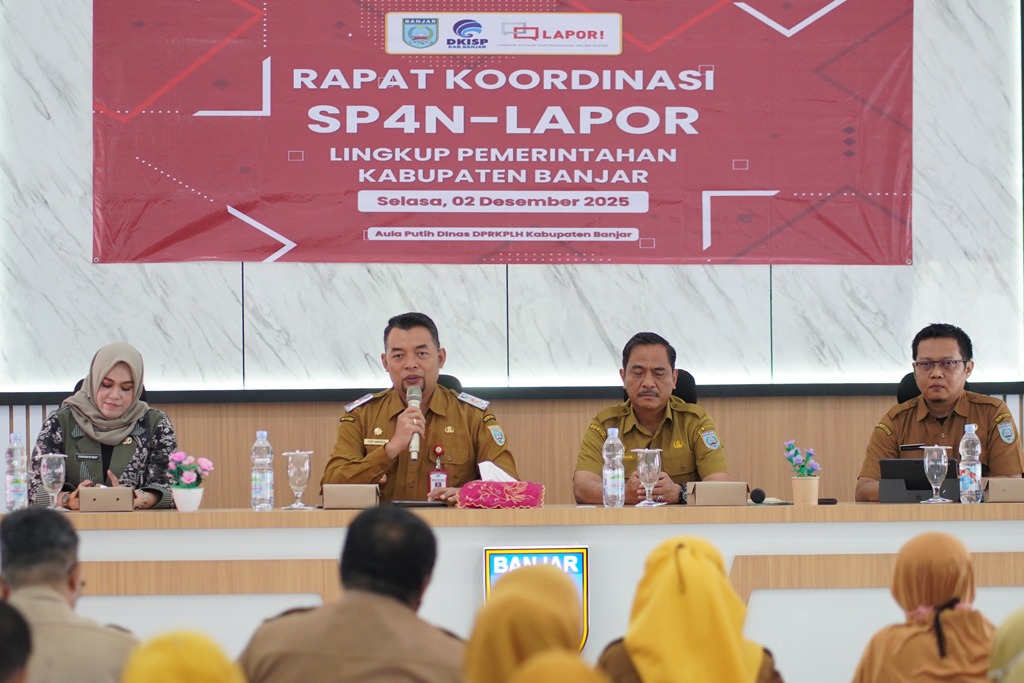 PUBLIKAINDONESIA, MARTAPURA – Sekretaris Daerah (Sekda) Kabupaten Banjar, H Yudi Andrea, menegaskan pentingnya percepatan respon Satuan Kerja Perangkat Daerah (SKPD) terhadap berbagai laporan masyarakat. Pesan itu disampaikannya saat membuka Rapat Koordinasi (Rakor) Sistem Pengelolaan Pengaduan Pelayanan Publik Nasional (SP4N) – Layanan Aspirasi dan Pengaduan Online Rakyat (LAPOR!) di Aula Putih Kantor Dinas PRKPLH Kabupaten Banjar, Martapura, Selasa (2/12/2025) pagi.